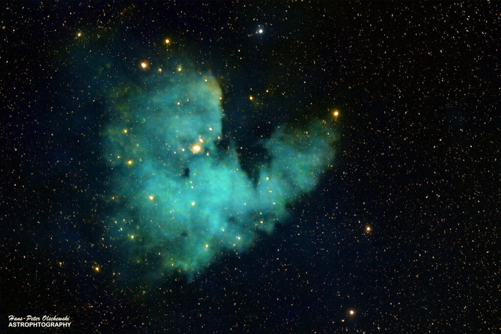 Der Pacman-Nebel im Sternbild Kassiopeia ist ein faszinierendes astronomisches Objekt. Er trägt seinen Namen aufgrund seiner Form, die an die bekannte Videospielfigur Pac-Man erinnert. Dieser Nebel ist eigentlich ein Emissionsnebel, der durch das Licht junger, massereicher Sterne zum Leuchten gebracht wird.