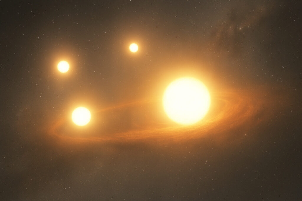 Äußere Komponenten: Weitere Sterne des Systems umkreisen das innere Paar auf größeren Umlaufbahnen. Die großen Abstände sorgen dafür, dass gravitative Wechselwirkungen begrenzt bleiben. Diese äußeren Sterne stabilisieren das System langfristig, ohne die inneren Paare stark zu stören.