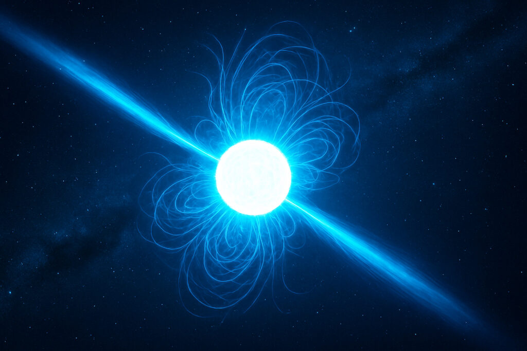 Ein Neutronenstern ist das extrem dichte Überbleibsel eines massereichen Sterns, der sein Leben in einer gewaltigen Supernova-Explosion beendet hat. Wenn der Kern eines solchen Sterns kollabiert, werden Protonen und Elektronen durch die immense Schwerkraft zu Neutronen verschmolzen. Das Ergebnis ist eine Kugel von der Masse unserer Sonne, die jedoch nur einen Durchmesser von etwa zwanzig Kilometern besitzt. Die Dichte in seinem Inneren ist so gewaltig, dass ein winziges Stück dieser Materie auf der Erde Milliarden von Tonnen wiegen würde. Durch die extreme Komprimierung während des Kollapses beginnt der Stern, sich mit einer rasanten Geschwindigkeit um seine eigene Achse zu drehen. Gleichzeitig wird das Magnetfeld des ursprünglichen Sterns auf einen winzigen Raum konzentriert und dadurch millionenfach verstärkt.