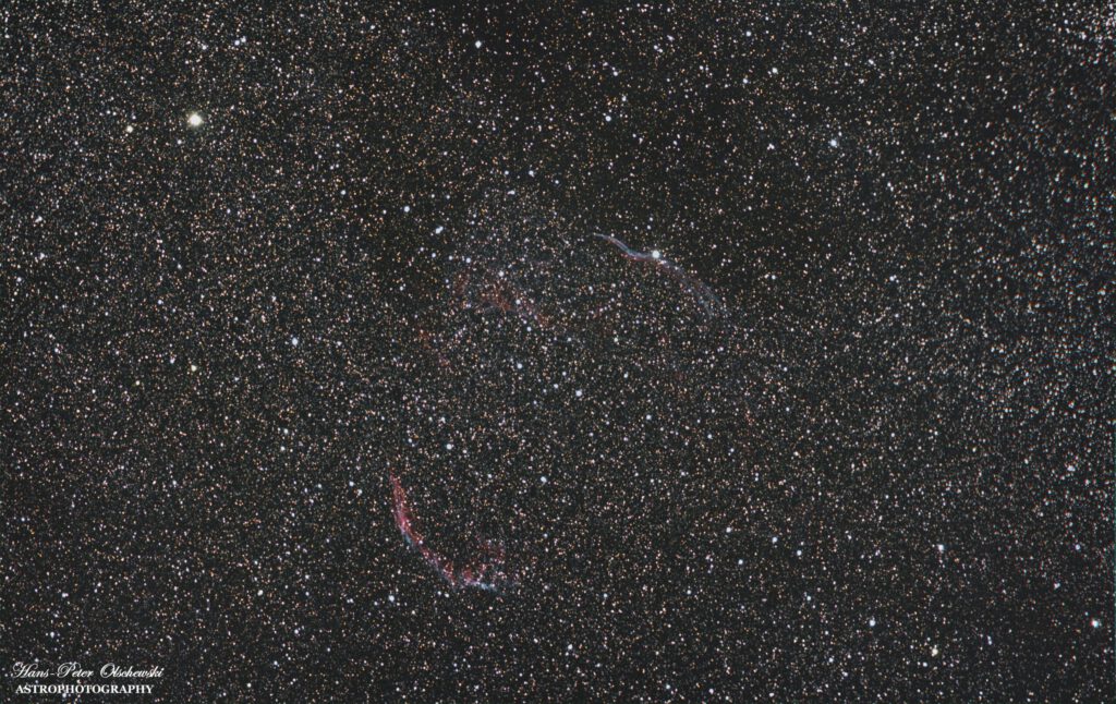 - Cirrus-Nebel (Veil Nebula): Dabei handelt es sich um die filigranen Überreste einer Supernova, die vor etwa 5.000 bis 8.000 Jahren explodierte. Der Nebel besteht aus mehreren Teilen (wie dem Sturmvogelnebel), die wie zarte Schleier aus glühendem Gas wirken.